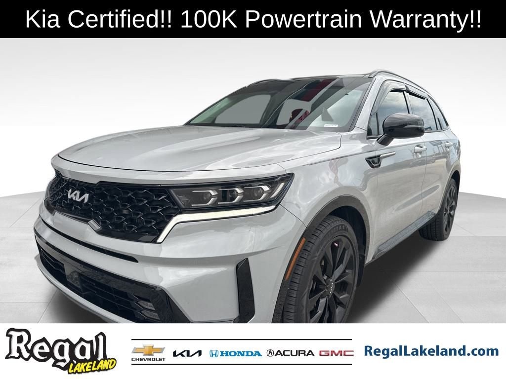 KIA CERTIFIED, APPLE CARPLAY AND ANDROID AUTO.Kia Certified Pre-Owned Details:* 165 Point Inspection* Vehicle History* Includes Rental Car and Trip Interruption Reimbursement. 3 month Sirius trial subscription* Powertrain Limited Warranty: 120 Month/100,000 Mile (whichever comes first) from original in-service date* Transferable Warranty* Warranty Deductible: $50* Limited Warranty: 12 Month/12,000 Mile (whichever comes first) Platinum Coverage from certified purchase date* Roadside Assistance2022 Kia Sorento SX Certified. Wolf Gray FWD 8-Speed DCT 2.5L I4 DGI Turbocharged DOHC 16V LEV3-ULEV70 281hpRecent Arrival! 22/29 City/Highway MPGCome test drive this vehicle @ our Regal Chevrolet / Kia location 1105 Bartow Rd. Lakeland FL 33801 (Beside Lakeland High School) To Schedule an appointment or for additional info call (863) 591-5890 /(863-591-5045)