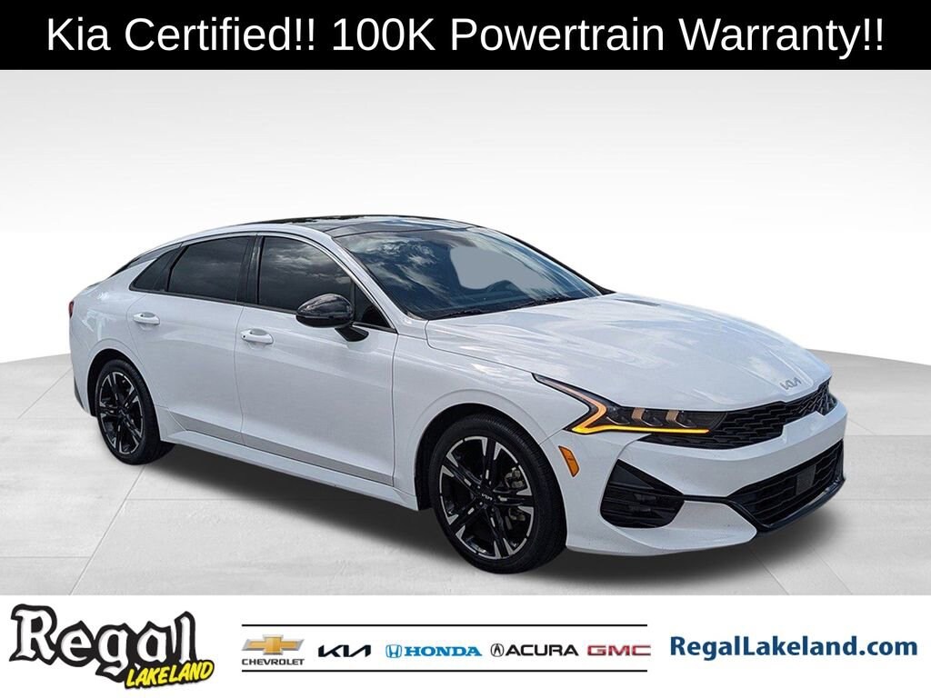 2023 Kia K5 GT-Line Certified. Glacial White Pearl FWD 8-Speed Automatic 1.6L I4 DGI Turbocharged DOHC 16V LEV3-ULEV70 180hp