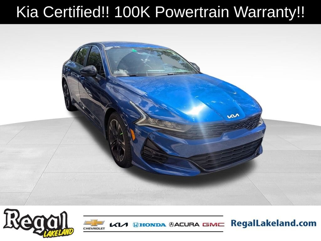 2023 Kia K5 GT-Line Certified. Sapphire Blue FWD 8-Speed Automatic 1.6L I4 DGI Turbocharged DOHC 16V LEV3-ULEV70 180hp